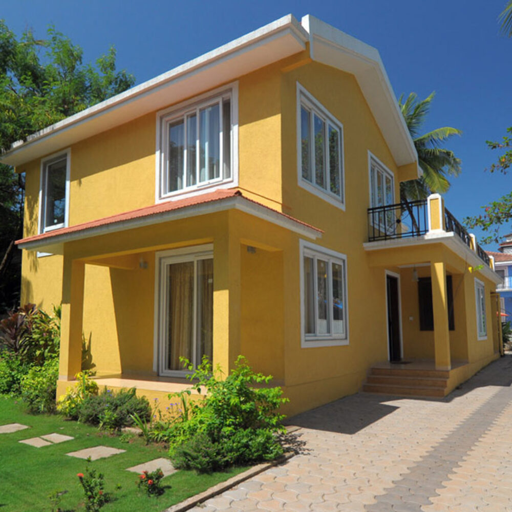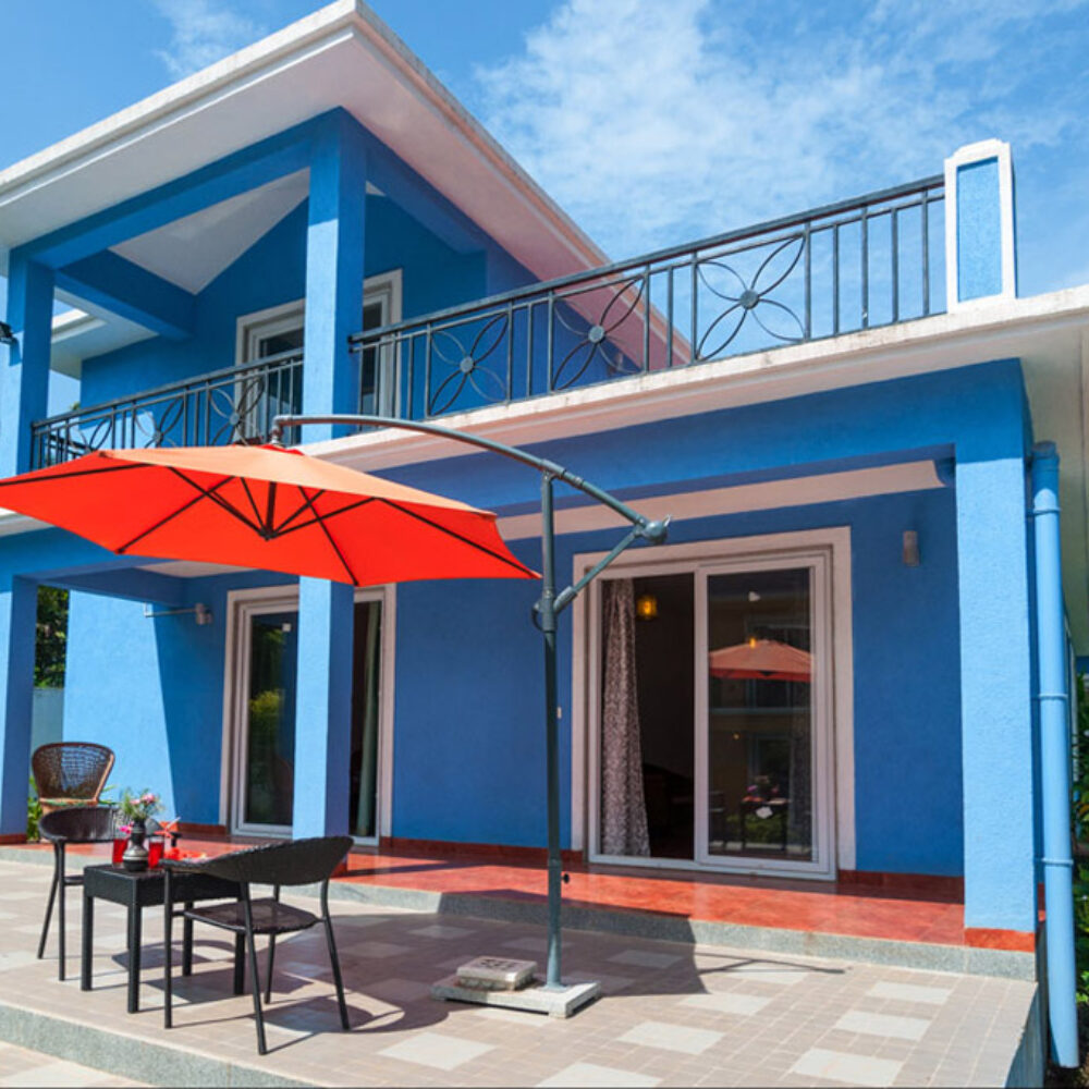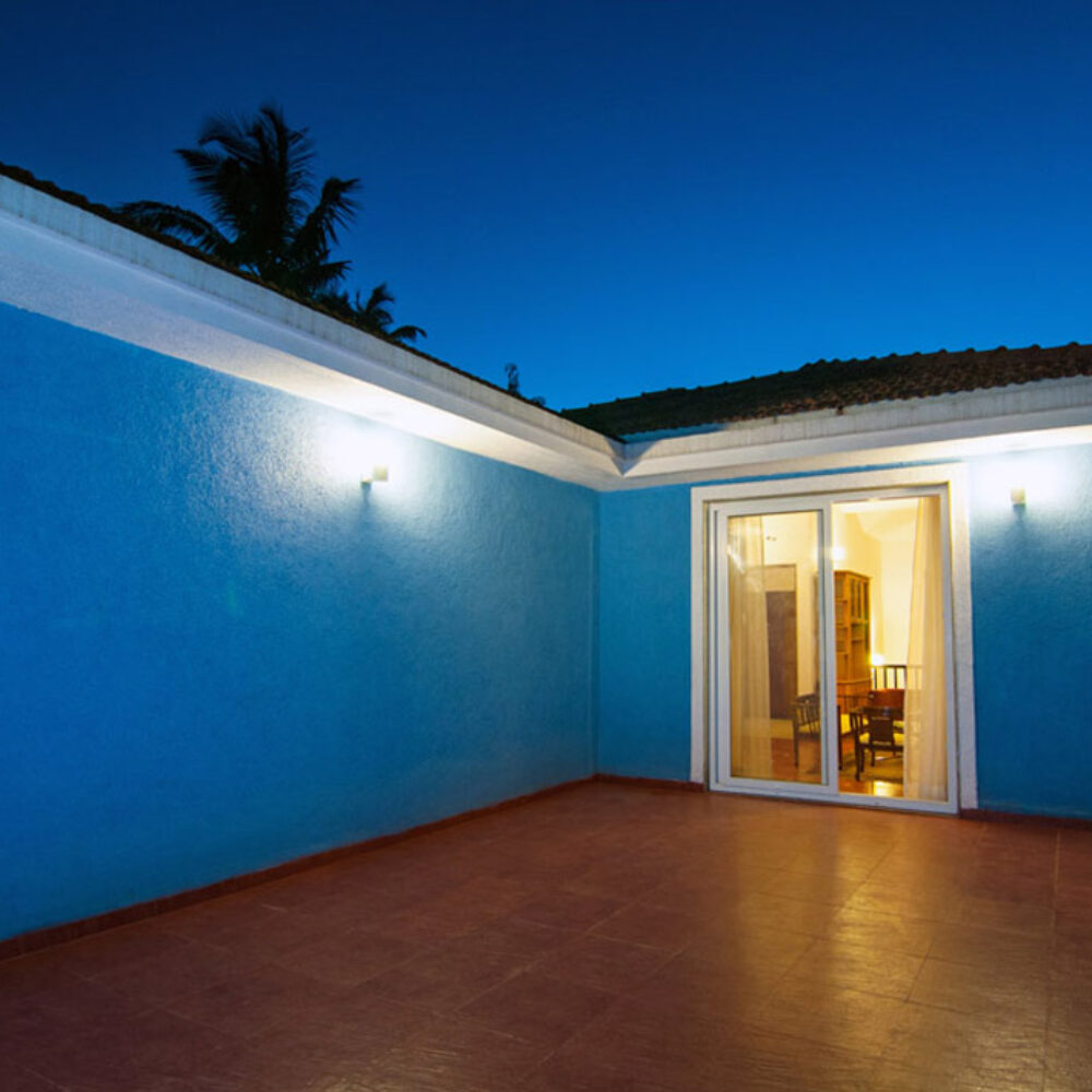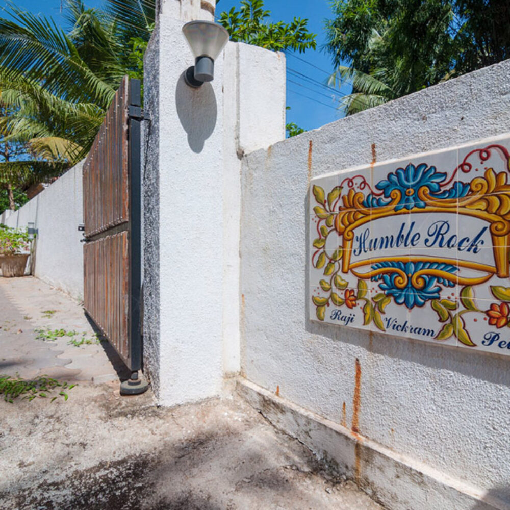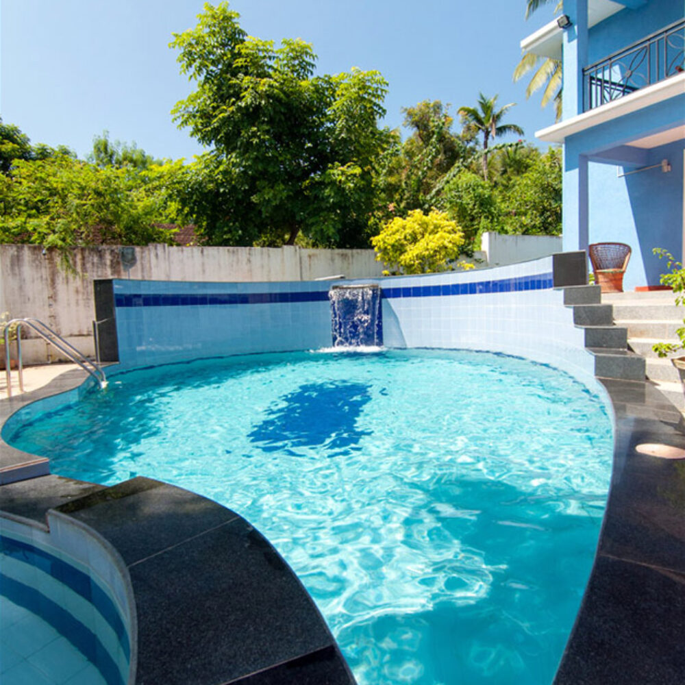 The BLUE Villa is within the Humble Rock Complex at Candolim which comprises 2 separate self catered Villas (Yellow and Blue), a Swimming Pool with a Jacuzzi Area, Gardens, an air-conditioned Pool Table Room, Generator (power back-up) and the Care-taker Quarters, all within a fenced plot. The Villas are located in a quiet, residential neighborhood, away from traffic. The main Chog-M road, lined with eateries is only about 200 mtrs away and the Candolim Beach is about 700 mtrs away.