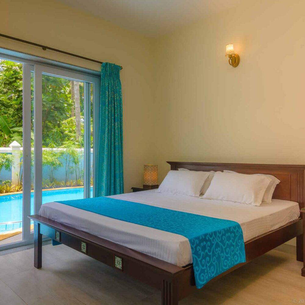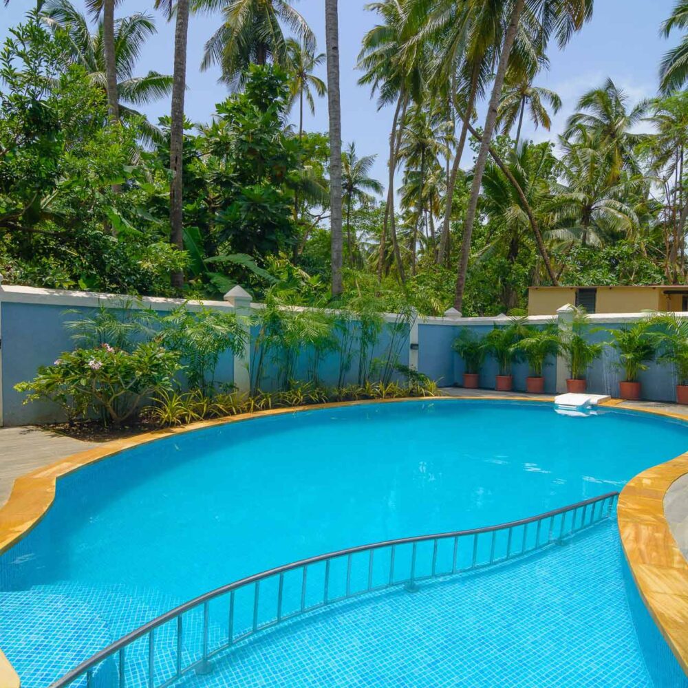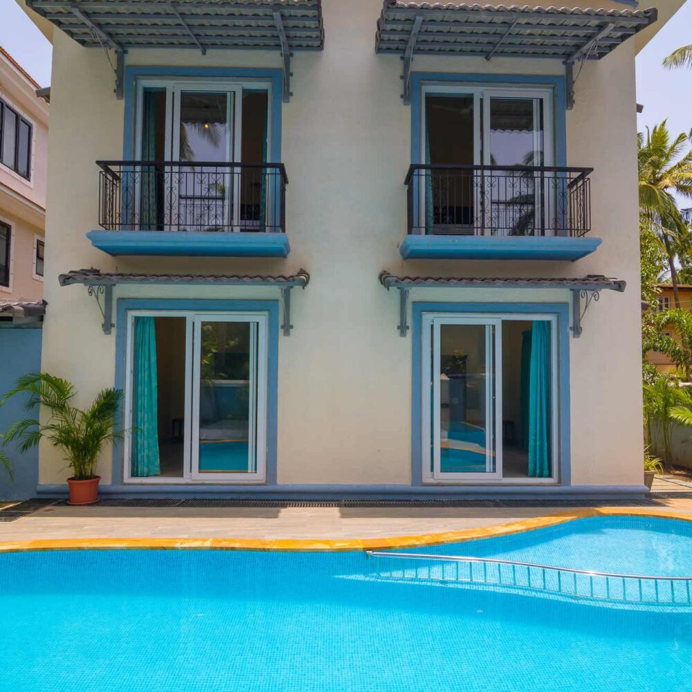 The Indigo Villa has a private Swimming Pool, an air-conditioned Pool Table Room, Generator (Power Back-up) and the Care-taker Quarters, all within a fenced plot. The Villa is located in a quiet, residential neighborhood, away from traffic. The main Chog-M road, lined with eateries is about 200 mtrs away and the Beach is about 900 mtrs away. The Villa has 7 A/C Bedrooms, with ensuite Bathrooms, Double Bed, Wardrobe; 2 furnished kitchens; Dining Area; 2 Drawing Rooms (one Air-conditioned) with 2 cable (tata sky) TVs.