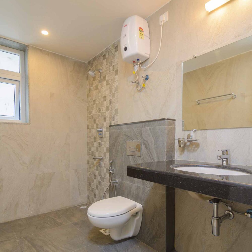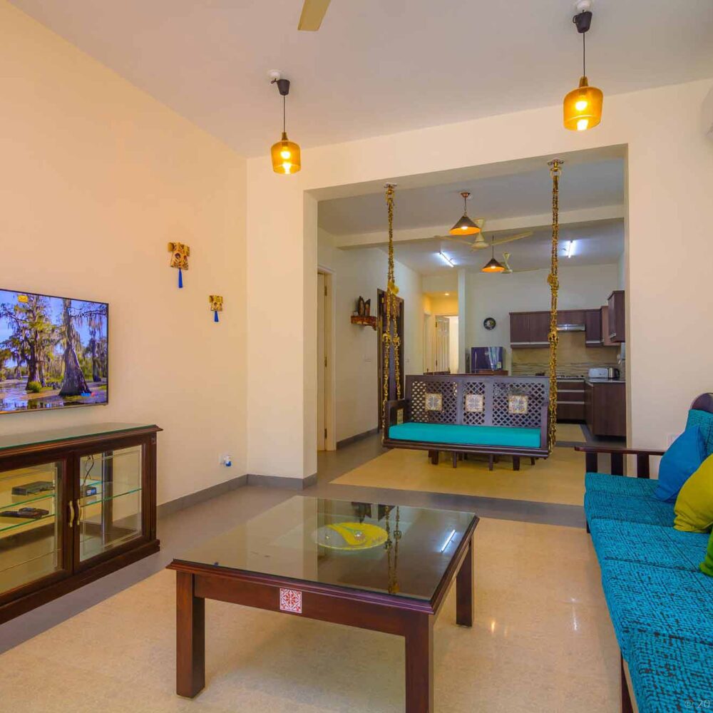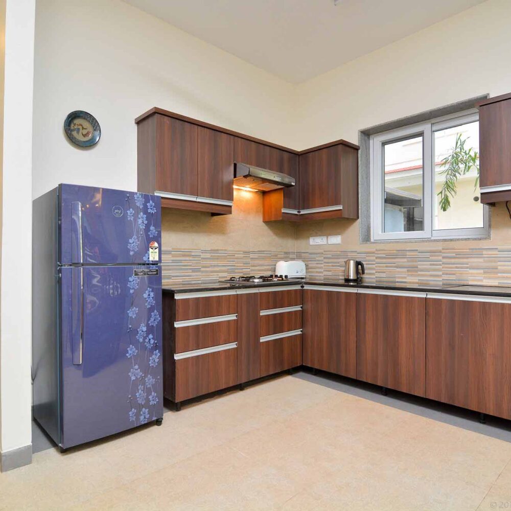 - Two, fully furnished kitchens with KENT RO drinking water, cooking range, microwave, fridge, utensils, crockery, etc