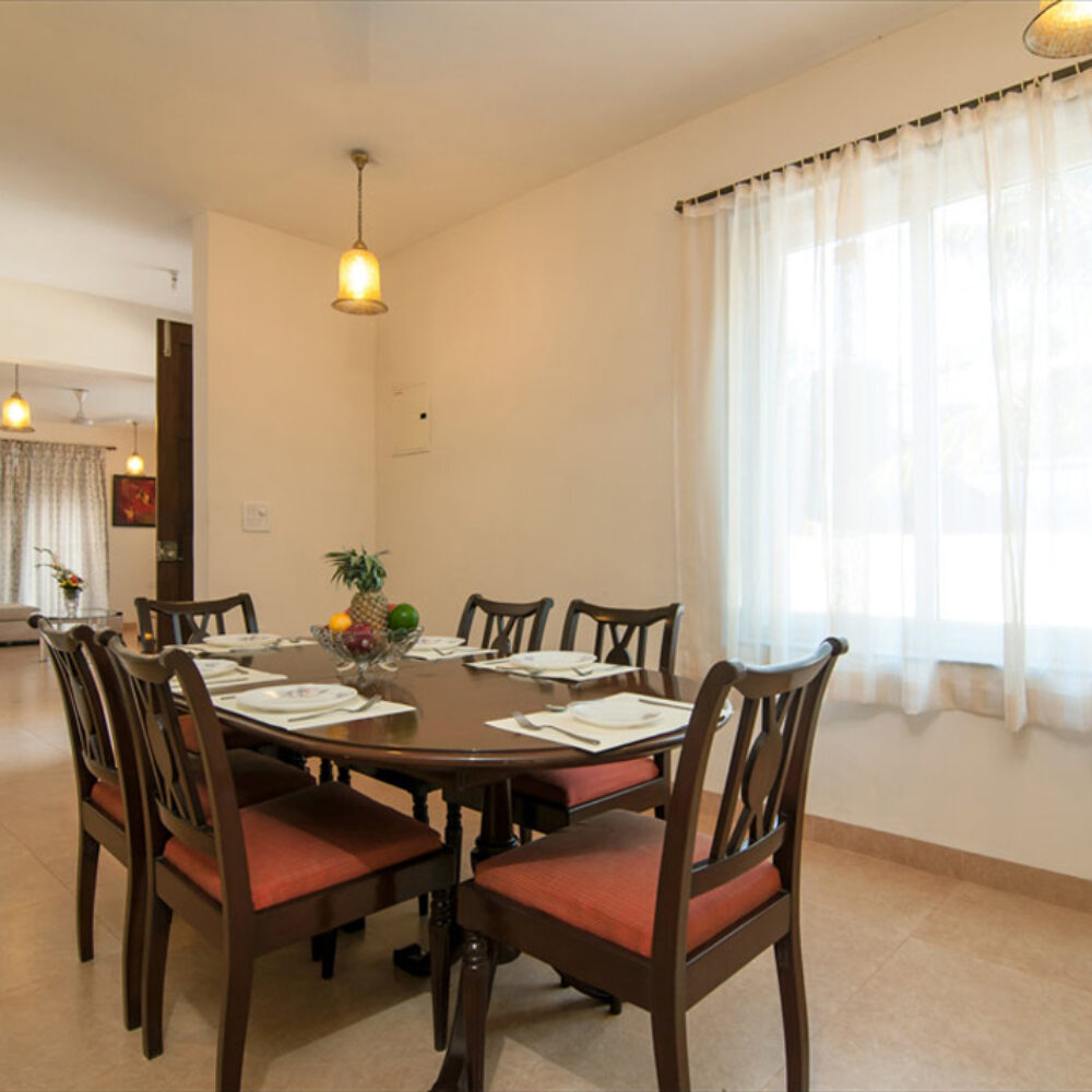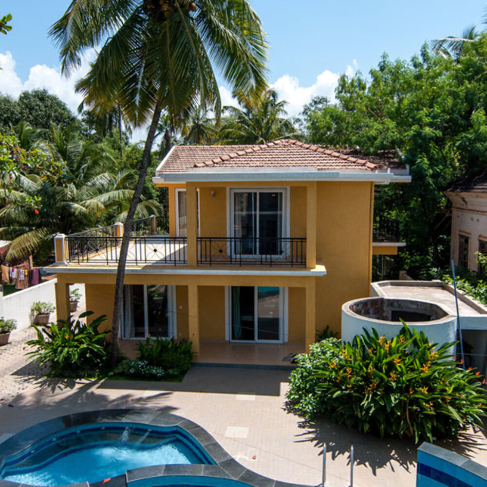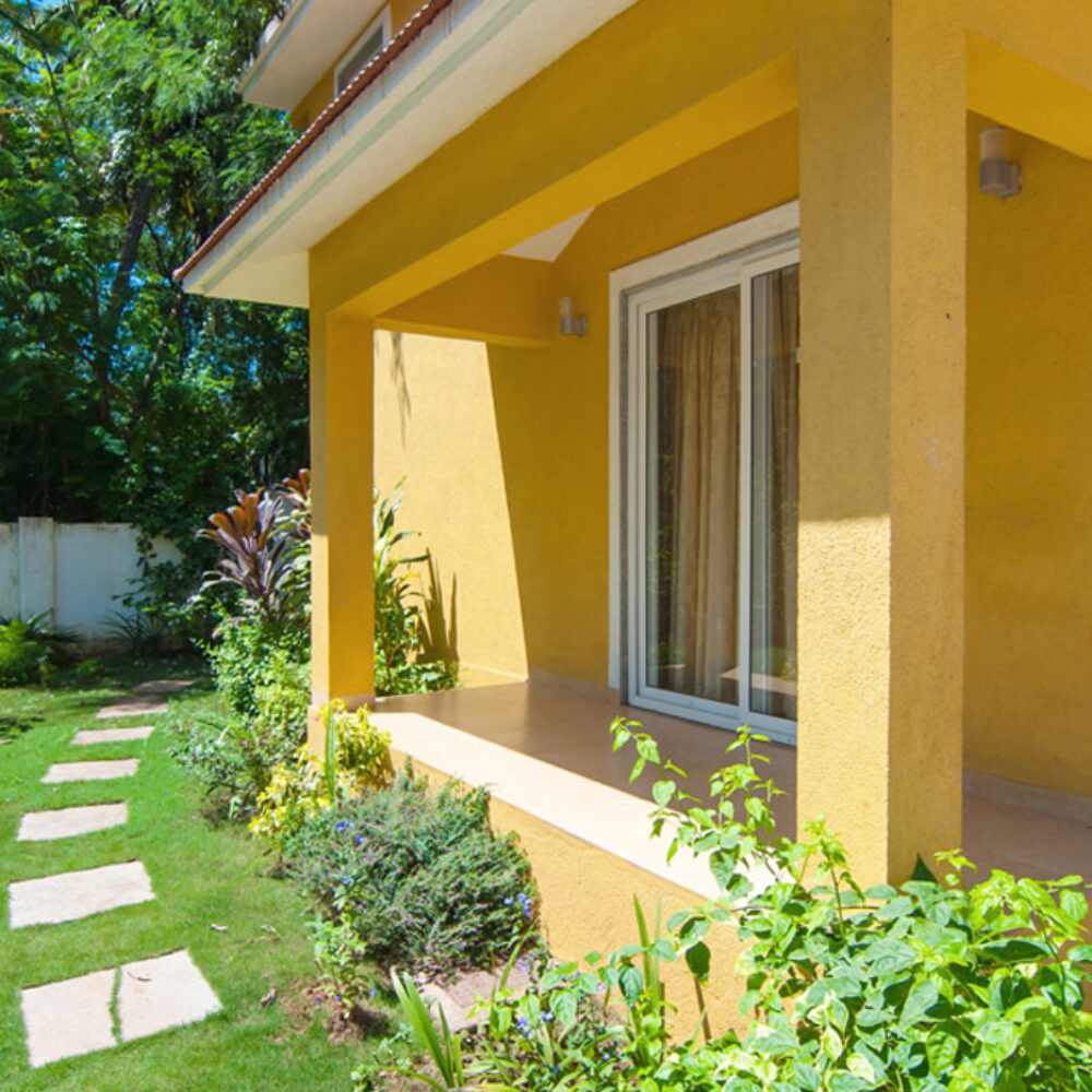 The YELLOW Villa is within the Humble Rock Complex at Candolim which comprises 2 separate self catered Villas (Yellow and Blue), a Swimming Pool with a Jacuzzi Area, Gardens, an air-conditioned Pool Table Room, Generator (power back-up) and the Care-taker Quarters, all within a fenced plot. The Villas are located in a quiet, residential neighborhood, away from traffic. The main Chog-M road, lined with eateries is only about 200 mtrs away and the Candolim Beach is about 700 mtrs away.